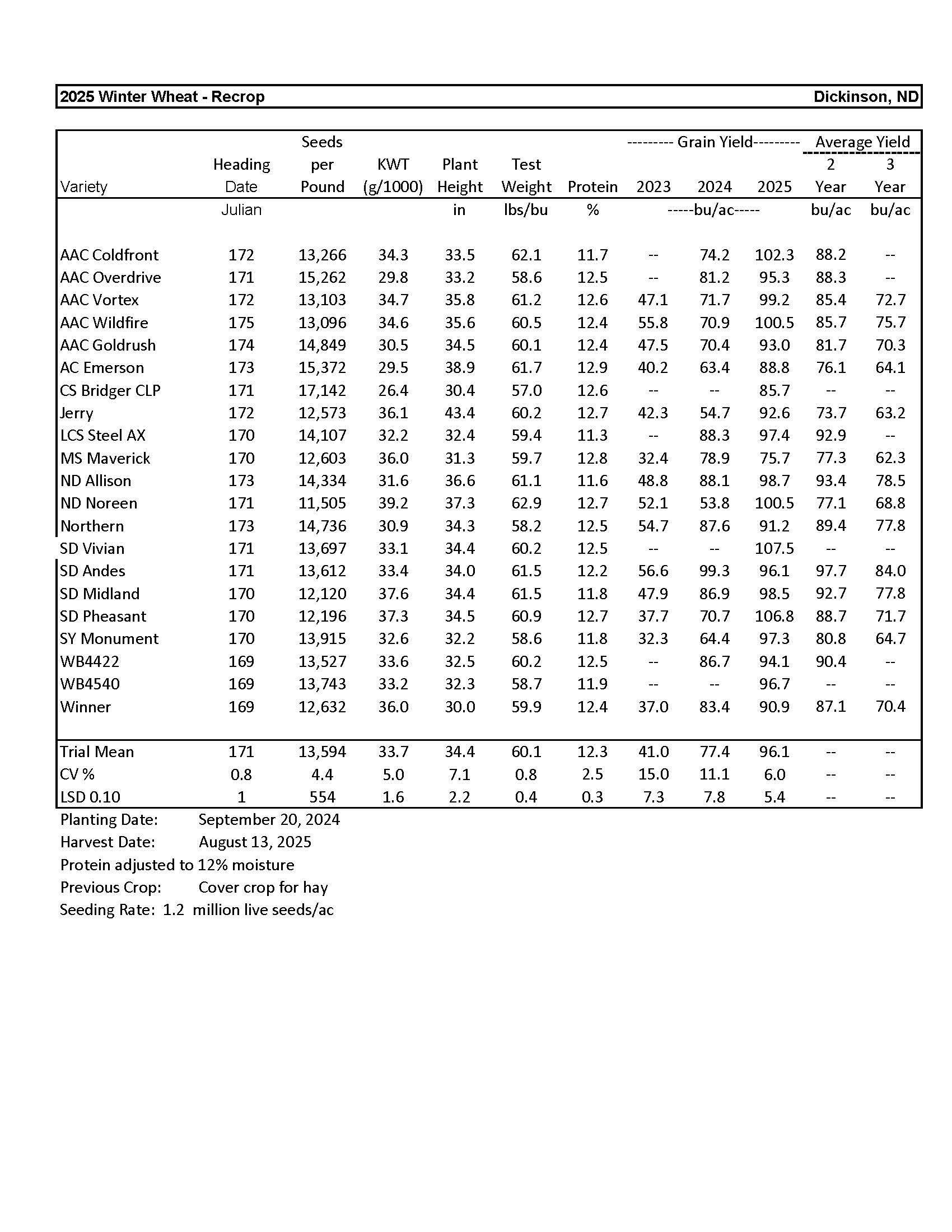 | Variety | Heading Date | Plant Height (in.) | Protein (%) | KWT (g/1000) | Test Weight (lb/bu) | Yield (bu/a) | Yield - 2yr Previous | Yield - Previous Year | Yield - 2 Year Avg | Yield - 3 Year Avg | Seeds Pound |