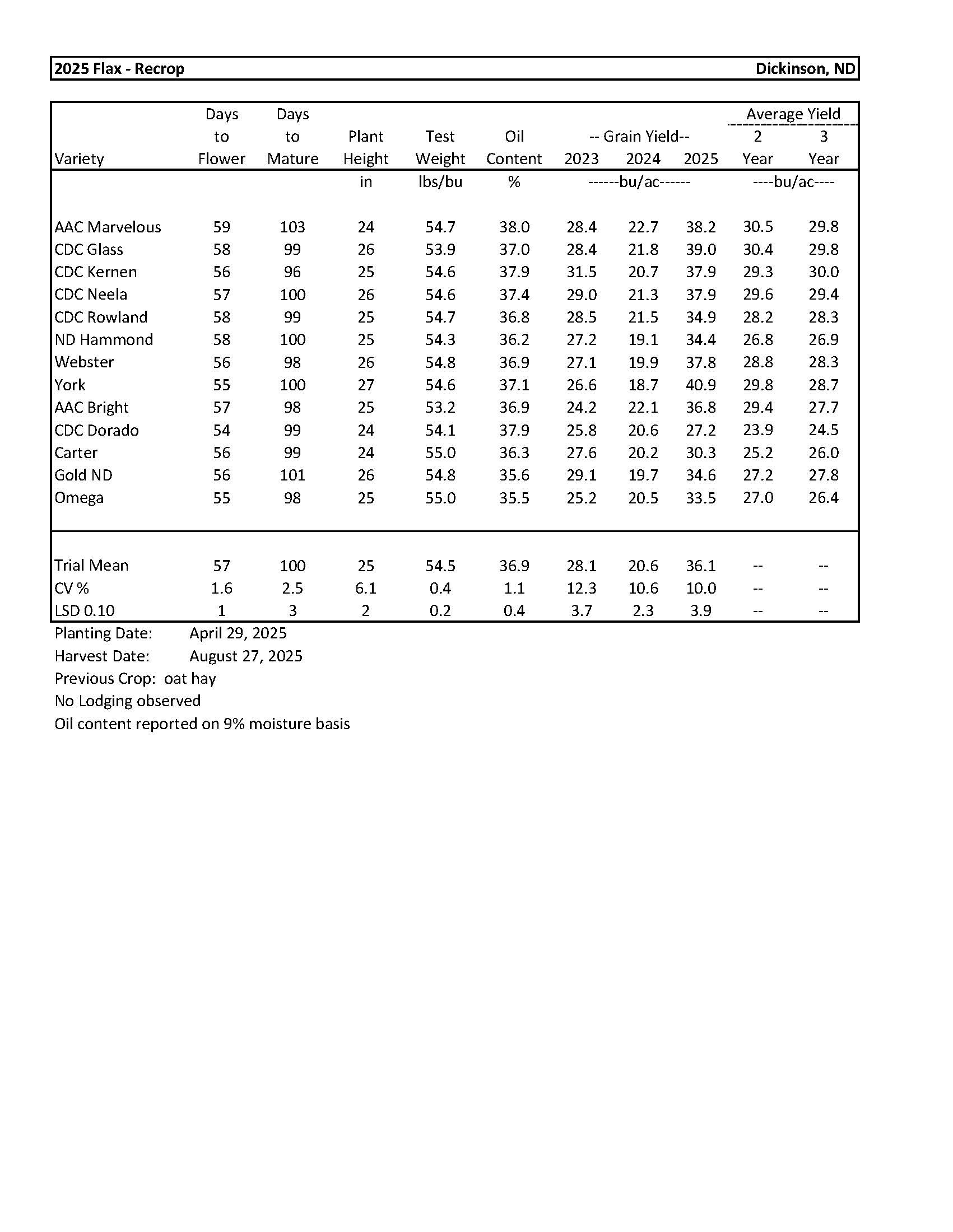 | Variety | Days To Flower (days) | Days To Maturity | Plant Height (in.) | Oil Content (%) | Test Weight (lb/bu) | Yield (lb/a) | Yield 2yr Previous | Yield Previous Year | Yield - 2 Year Avg (bu/a) | Yield - 3 Year Avg (bu/a) |
